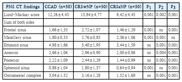 A total of 50 patients were classified into the CCAD group according to the above diagnostic procedure. Age and gender matched samples were extracted from the CRSwNP and CRSsNP (50 patients in each group), and we compared the measure among the three groups.