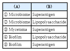 문 2. 미생물이 분비한 세포외 고분자 물질 속에 형성된 미생물의 삼차원적 공동체 (A)와 그람음성균의 외막을 형성하는 세균성 내독소 (B)는 불응성 비부비동염(refractory rhinosinusitis)의 원인으로 알려져 있다. 바르게 짝지어진 것은?