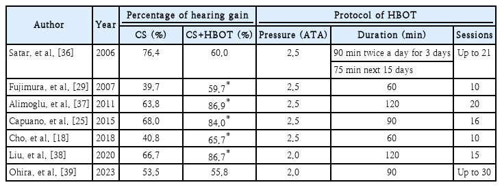 고압산소치료에 대한 대부분의 전향적인 연구는 고압산소치료와 약물치료의 병합과 단독 약물치료를 비교하고 있으며, 여러 연구에서 전신 혹은 고실내 스테로이드와 병합하였을 때 스테로이드 단독 요법에 비해 청각 향상이 높았던 것으로 보고된다. 스테로이드와 고압산소치료의 돌발성 난청에서 역할이 다른 점을 고려하면 두 치료의 병합은 청력개선에 상승 효과를 줄 수 있을 것으로 기대할 수 있다. 고압산소치료를 고용량 스테로이드와 병합시 최소 10 dB 이상 개선된 회복률에서 59.7%-86.9%로서 스테로이드 단독군의 39.7%-76.4%에 비해 높은 경향을 보였다[8]. 7개의 연구 중 5개 연구에서 회복률은 스테로이드와 고압산소치료 병합군이 전신 스테로이드 단독 혹은 전신 및 고실내 스테로이드 군에 비해 높았다(Table 1). Hosokawa 등[17]은 전신 스테로이드 단독군과 전신 및 고실내 스테로이드 병합군 및 고압산소치료와 전신스테로이드 병합군 등 세 그룹을 비교하여, 고압산소치료와 스테로이드 병행군에서 다른 군에 비해 청력 회복률이 유의하게 높았던 것으로 보고했다. 본 연구의 저자들은 70 dB 이상의 돌발성 난청 환자군을 무작위 대조시험을 통해 전신 및 고실내 스테로이드를 병합 투여한 대조군과 이에 추가로 고압산소치료를 더한 실험군을 비교하였으며, 저주파(250, 500 Hz) 및 어음명료도의 개선이 대조군보다 우수하였다[18]. 2022년 3편의 무작위대조시험에 대한 메타분석에서 약물치료만을 시행한 대조군에 비해 고압산소치료를 추가한 실험군에서 평균 10.3 dB의 개선이 있었으며, 청력 회복의 교차비는 4.3으로 고압산소치료의 병합요법의 효과를 보고했다[19]. 물론 스테로이드 단독 치료와 고압산소병합과 비교하여 의미있는 차이를 보이지 않은 연구도 존재하였다[8]. 다만 이 연구들에서는 증상 발생 30일까지 연구에 포함되어 결과에 영향을 주었을 가능성이 있다.