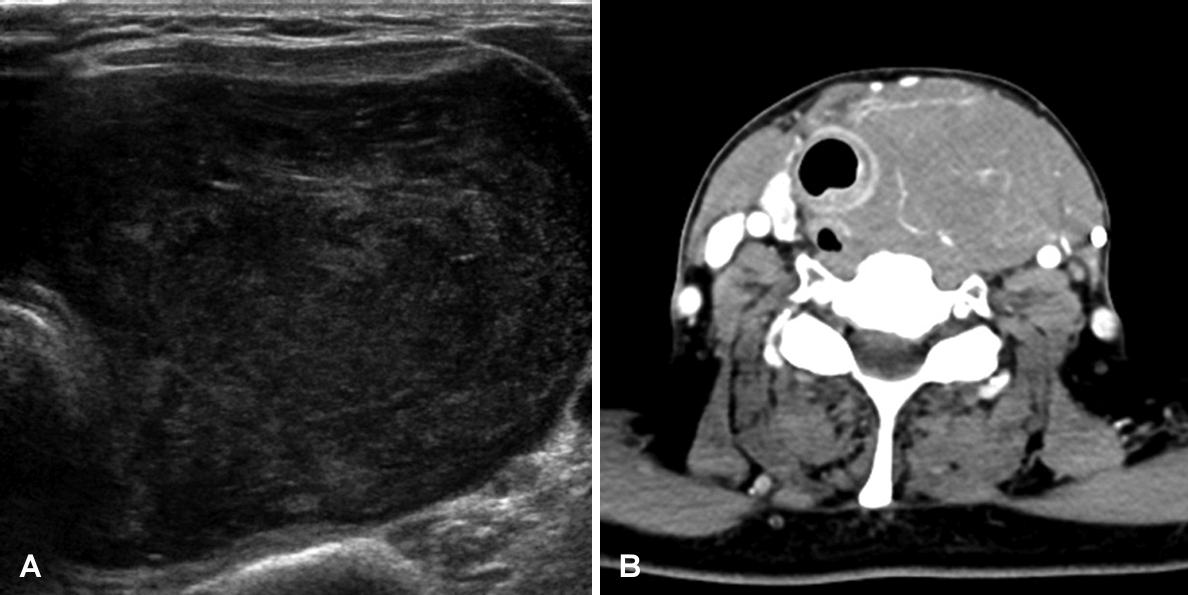 Computed tomographic and ultrasound findings of primary thyroid lymphoma. About 5.1×6.4×10.0 cm sized huge hypoechoic mass in ultrasonography and it was homogenously enhanced in CT scan.