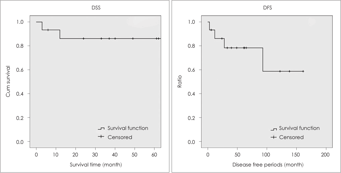 5년 질병 특이 생존율은 86.2%였고, 5년 무병 생존율은 78.3%였다(Fig. 2).