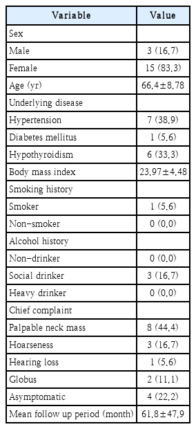 총 18명의 원발성 갑상선 림프종 환자가 포함되었다. 18명 중 남성은 3명(16.7%), 여성은 15명(83.3%)이었으며, 내원 당시 평균 나이는 66.4±8.78세였다. 기저질환으로 고혈압 7명(38.9%), 당뇨 1명(5.6%)이 있었으며 6명(33.3%)에서 갑상선 기능저하증이 동반되었다. 평균 체질량지수는 23.97±4.48이었으며, 흡연자는 1명(5.6%), 음주력은 3명(16.7%) 있었다. 주증상으로는 전경부의 만져지는 종물을 주소로 한 환자가 8명(44.4%)으로 제일 많았으며, 우연히 발견된 무증상 환자가 4명, 이외 애성 3명, 이물감 2명, 비인두 림프조직 증식으로 인한 삼출성 중이염 때문에 발생한 난청 1명이 있었다. 이들의 평균 추적 관찰 기간은 61.8±47.9개월이었다(Table 1).