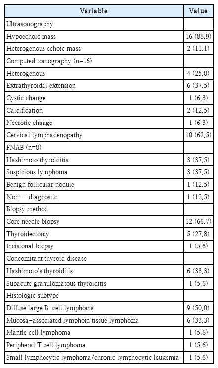 조직검사 결과로는 diffuse large B cell lymphoma (DLBL) 9명(50.0%), mucosa-associated lymphoid tissue (MALT) lymphoma 6명(33.3%), mantle cell lymphoma 1명(5.56%), peripheral T cell lymphoma 1명(5.56%) 그리고 small lymphocytic lymphoma/chronic lymphocytic leukemia (SLL/CLL) 1명(5.56%)이었으며, 동반된 갑상선 질환으로 하시모토 갑상선염이 6명(33.3%), 아급성 육아종 갑상선염 1명(5.6%)이었다(Table 2).