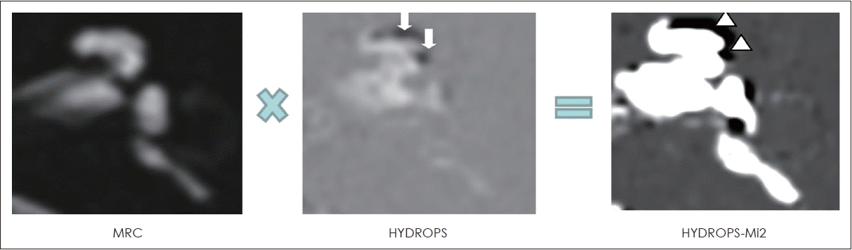 A HYDROPS-Mi2 image with maximized contrast can be generated by multiplying the MRC and the hydrops images. The endolymphatic space (arrows) identified in the hydrops image becomes more prominent in the Mi2 image (arrowheads). MRC, magnetic resonance cisternography; HYDROPS, HYbriD of Reversed image Of Positive endolymph signal and native image of positive perilymph Signal.