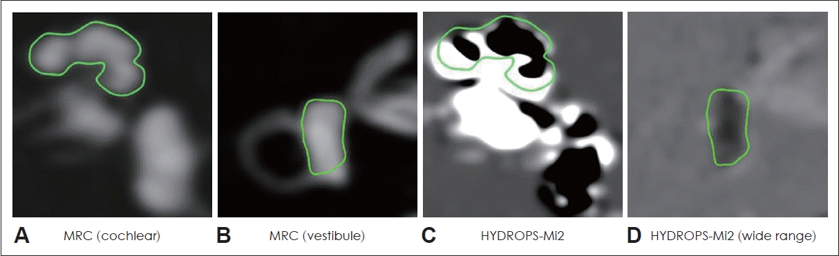 2000년대 중반 이래로 3T MRI를 이용한 three-dimensional fluid-attenuated inversion recovery (3D-FLAIR) 시퀀스(sequence)는 메니에르병에서 내림프 수종을 확인하기 위하여 이용되어 왔다[10]. 최근에는 3D-FLAIR 시퀀스와 inversion recovery turbo spin echo with real reconstruction (3D real-IR) 시퀀스가 조영 증강된 외림프(perilymph)와 조영증강 되지 않는 내림프(endolymph) 간의 신호 차이(signal differences)를 식별하기 위한 MRI 프로토콜로서 가장 많이 이용된다[17]. 3D real-IR 시퀀스의 주요 장점은 주위 뼈(bone)를 중간(grey) 신호로 나타냄으로써, 외림프, 내림프, 인접한 뼈가 하나의 영상에서 구분될 수 있다는 것이다[18]. MRI 영상은 신호를 최대화하기 위하여 32개 이상 채널(channel)의 다중 수신 채널(multiple receiver channel)과 전용 헤드 코일(dedicated head coil)이 포함된 3T MRI에서 최적으로 획득되었다. 기본 MRI 스캔 시퀀스는 다음과 같다: 1) 총 내림프액, 외림프액의 해부학적 참고치(anatomical reference)를 위한 heavily T2-weighted (hT2W) MR cisternography (MRC), 2) 외림프 공간을 시각화하기 위한 2250 ms 역전 시간(inversion time)의 hT2W-3D-FLAIR (positive perilymph image, PPI), 3) 내림프 공간을 평가하기 위한 2050 ms 역전 시간의 hT2W-3D-IR (positive endolymph image, PEI). 특히 PEI 시퀀스는 역전 시간이 2050 ms라는 점을 제외하면 PPI의 시퀀스와 동일하다. 비교를 용이하게 하기 위하여 MRC, PPI, PEI는 동일한 field of view, 매트릭스 크기(matrix size), 슬라이스 두께(slice thickness)를 적용하여야 한다. 다음 단계는 스캐너 콘솔(scanner console)에 HYDROPS (HYbriD of Reversed image Of Positive endolymph signal and native image of positive perilymph Signal)를 생성하기 위하여 PPI 이미지로부터 PEI 이미지를 제하는 과정이다. 이 과정을 마치면 내림프 공간의 확장 정도를 시각적으로 분석하는 것이 가능하다.