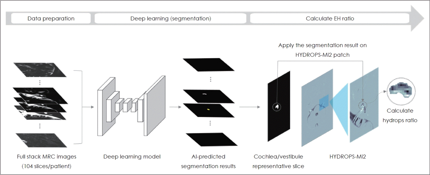 CNN을 이용하여 정확하게 내림프 수종을 측정하기 위하여 다음의 과정들이 필요하다: 1) 훈련을 위한 자료의 준비(data prepration); 2) 훈련된 영상에 기반한 내이 기관(와우, 전정기관)의 정확한 분할(accurate segmentation); 3) 분할된 영역에서 내림프 수종 비의 정확하고 자동적인 계산(accurate and automatic calculation of the EH ratio)이 바로 그 것이다(Fig. 3).
