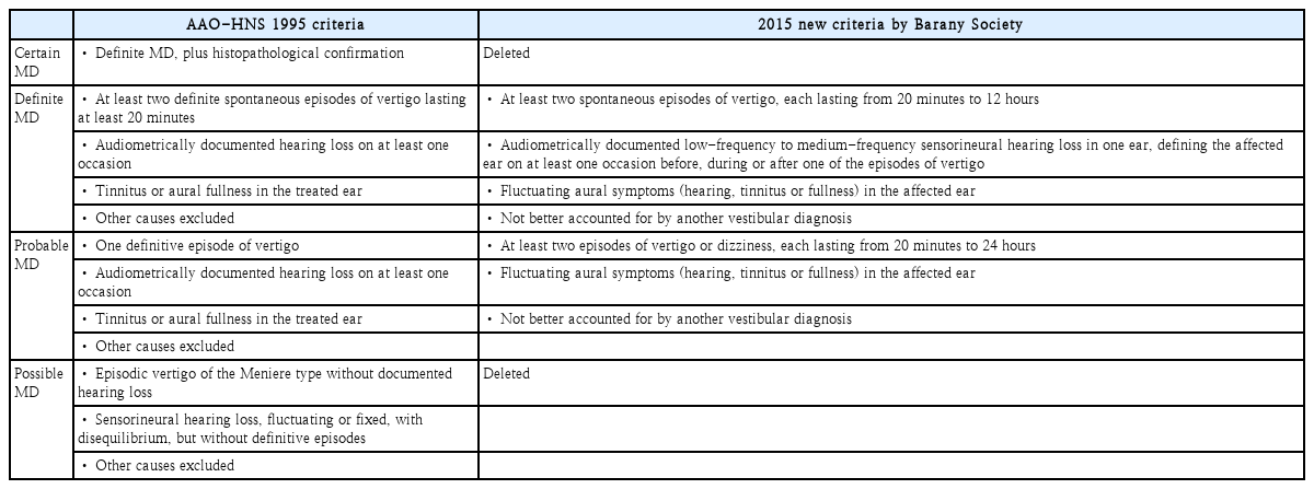 메니에르병의 진단기준은 그동안 몇 번의 변화를 거쳐왔다. 1972년 The American Academy of Otolaryngology 산하 ‘A hearing balance subcommittee’에서 메니에르병의 정의와 진단기준을 정하였으며, 이후 ‘American Association of Otolaryngology-Head and Neck Surgery (AAO-HNS)’에서 1985년과 1995년에 진단기준을 변경하였다[4]. 한동안 1995년 AAO-HNS 기준이 보편적으로 받아들여졌으나 확실한 메니에르병(certain MD)은 생전에 진단이 불가능하였고 가능성이 있는 메니에르병(possible MD)은 진단적 가치가 낮다고 판단되었다. 따라서 2015년에 Ba´ra´ny Society에서 “certain,” “possible” 메니에르병을 삭제한 새로운 진단 기준을 발표하여 널리 사용 중이다(Table 1) [5].