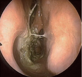 문 1. 58세 남자 환자가 지속적인 코막힘을 주소로 내원하였다. 악취를 동반한 과도한 가피 형성 소견이 동반되었으며 다른 전신증상은 보이지 않았다. 이 환자의 치료에 대해 가장 적절한 것은?
